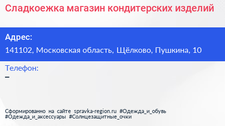 Сладкоежка, магазин кондитерских изделий по адресу 141102, Московская область, Щёлково, Пушкина, 10 в дальнейшем Организация, размещена в следующих категориях: