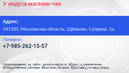 У индуса, магазин чая по адресу 141103, Московская область, Щёлково, Супруна, 1а в дальнейшем Организация, размещена в следующих категориях: