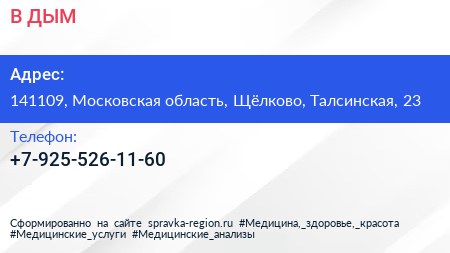 В ДЫМ по адресу 141109, Московская область, Щёлково, Талсинская, 23 в дальнейшем Организация, размещена в следующих категориях: