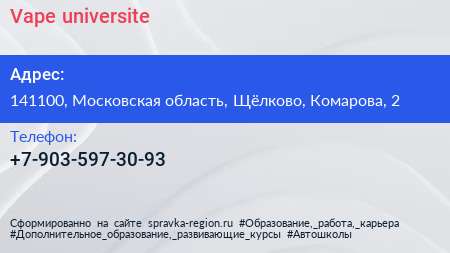 Vape universite по адресу 141100, Московская область, Щёлково, Комарова, 2 в дальнейшем Организация, размещена в следующих категориях: