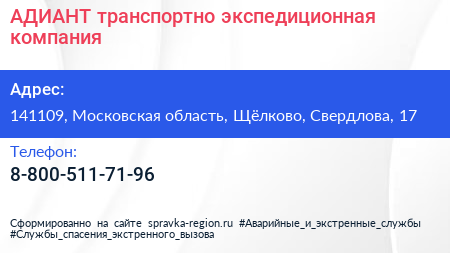 АДИАНТ, транспортно-экспедиционная компания по адресу 141109, Московская область, Щёлково, Свердлова, 17 в дальнейшем Организация, размещена в следующих категориях: