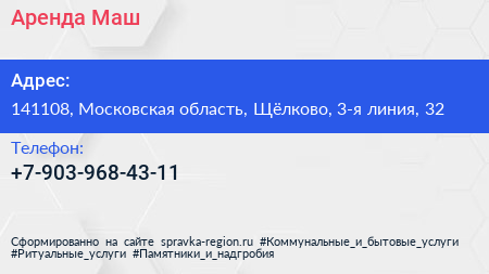 Аренда Маш по адресу 141108, Московская область, Щёлково, 3-я линия, 32 в дальнейшем Организация, размещена в следующих категориях: