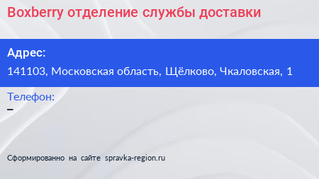 Boxberry, отделение службы доставки по адресу 141103, Московская область, Щёлково, Чкаловская, 1 в дальнейшем Организация, размещена в следующих категориях:
