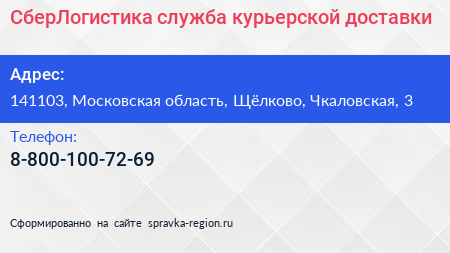 СберЛогистика, служба курьерской доставки по адресу 141103, Московская область, Щёлково, Чкаловская, 3 в дальнейшем Организация, размещена в следующих категориях: