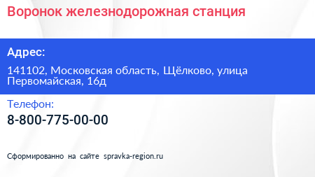 Воронок, железнодорожная станция по адресу 141102, Московская область, Щёлково, улица Первомайская, 16д в дальнейшем Организация, размещена в следующих категориях: