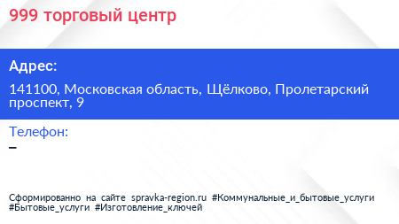 999!, торговый центр по адресу 141100, Московская область, Щёлково, Пролетарский проспект, 9 в дальнейшем Организация, размещена в следующих категориях: