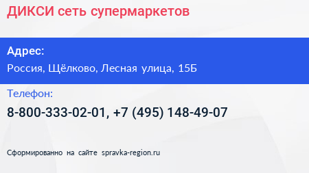 ДИКСИ, сеть супермаркетов по адресу Месье Пивасье, 15Б, улица Ватутина, КП "Лосиный парк", Валентиновка, Оболдино, городской округ Щёлково, Московская область, Центральный федеральный округ, 141181, Россия в дальнейшем Организация, размещена в следующих категориях: