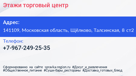 Этажи, торговый центр по адресу 141109, Московская область, Щёлково, Талсинская, 8 ст2 в дальнейшем Организация, размещена в следующих категориях: