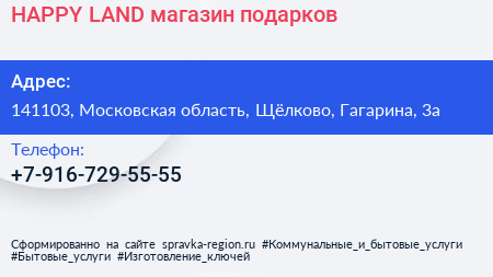 HAPPY LAND, магазин подарков по адресу 141103, Московская область, Щёлково, Гагарина, 3а в дальнейшем Организация, размещена в следующих категориях: