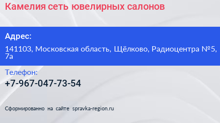 Камелия, сеть ювелирных салонов по адресу 141103, Московская область, Щёлково, Радиоцентра №5, 7а в дальнейшем Организация, размещена в следующих категориях: