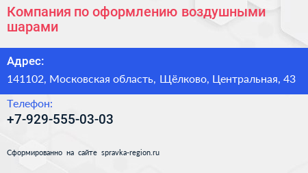 Компания по оформлению воздушными шарами по адресу 141102, Московская область, Щёлково, Центральная, 43 в дальнейшем Организация, размещена в следующих категориях: