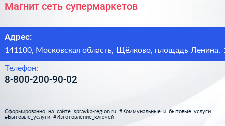Магнит, сеть супермаркетов по адресу 141100, Московская область, Щёлково, площадь Ленина, 1 в дальнейшем Организация, размещена в следующих категориях:
