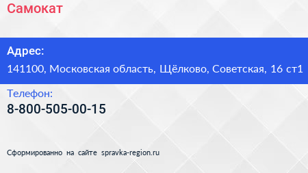 Самокат по адресу 141100, Московская область, Щёлково, Советская, 16 ст1 в дальнейшем Организация, размещена в следующих категориях: