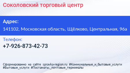 Соколовский, торговый центр по адресу 141102, Московская область, Щёлково, Центральная, 96а в дальнейшем Организация, размещена в следующих категориях: