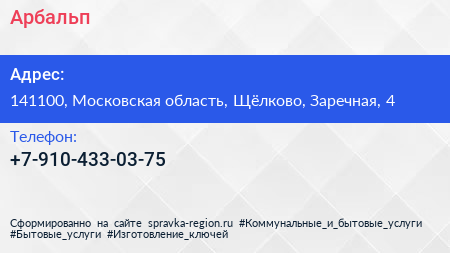 Арбальп по адресу 141100, Московская область, Щёлково, Заречная, 4 в дальнейшем Организация, размещена в следующих категориях: