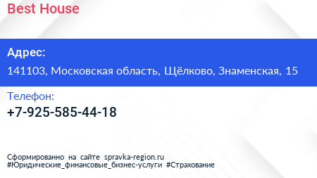 Best House по адресу 141103, Московская область, Щёлково, Знаменская, 15 в дальнейшем Организация, размещена в следующих категориях:
