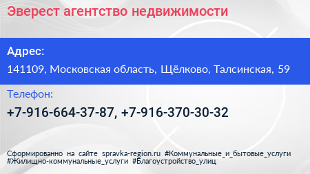 Эверест, агентство недвижимости по адресу 141109, Московская область, Щёлково, Талсинская, 59 в дальнейшем Организация, размещена в следующих категориях: