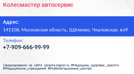 Колесмастер, автосервис по адресу 141108, Московская область, Щёлково, Чкаловская, вл9 в дальнейшем Организация, размещена в следующих категориях: