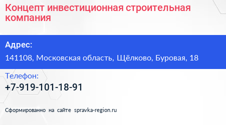 Концепт, инвестиционная строительная компания по адресу 141108, Московская область, Щёлково, Буровая, 18 в дальнейшем Организация, размещена в следующих категориях: