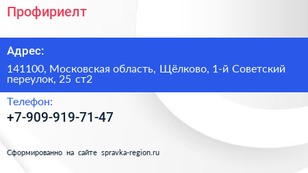 Профириелт по адресу 141100, Московская область, Щёлково, 1-й Советский переулок, 25 ст2 в дальнейшем Организация, размещена в следующих категориях: