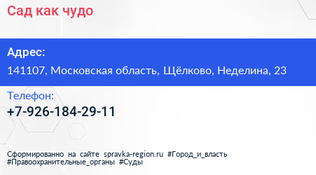 Сад как чудо по адресу 141107, Московская область, Щёлково, Неделина, 23 в дальнейшем Организация, размещена в следующих категориях: