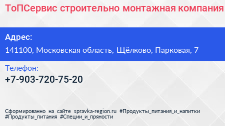 ТоПСервис, строительно-монтажная компания по адресу 141100, Московская область, Щёлково, Парковая, 7 в дальнейшем Организация, размещена в следующих категориях: