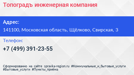 Топоградъ, инженерная компания по адресу 141100, Московская область, Щёлково, Свирская, 3 в дальнейшем Организация, размещена в следующих категориях: