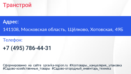 Транстрой по адресу 141108, Московская область, Щёлково, Хотовская, 49Б в дальнейшем Организация, размещена в следующих категориях: