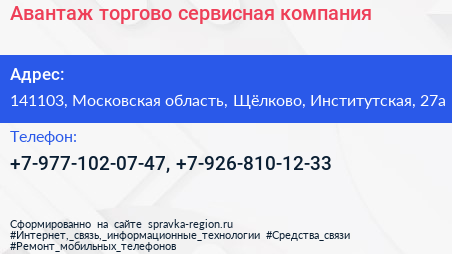 Авантаж, торгово-сервисная компания по адресу 141103, Московская область, Щёлково, Институтская, 27а в дальнейшем Организация, размещена в следующих категориях: