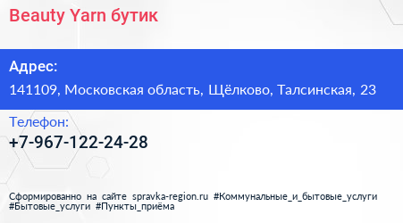 Beauty Yarn, бутик по адресу 141109, Московская область, Щёлково, Талсинская, 23 в дальнейшем Организация, размещена в следующих категориях: