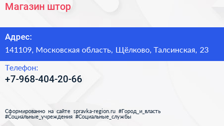 Магазин штор по адресу 141109, Московская область, Щёлково, Талсинская, 23 в дальнейшем Организация, размещена в следующих категориях: