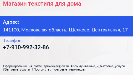 Магазин текстиля для дома по адресу 141100, Московская область, Щёлково, Центральная, 17 в дальнейшем Организация, размещена в следующих категориях: