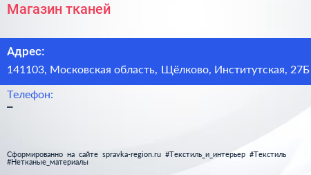 Магазин тканей по адресу 141103, Московская область, Щёлково, Институтская, 27Б в дальнейшем Организация, размещена в следующих категориях:
