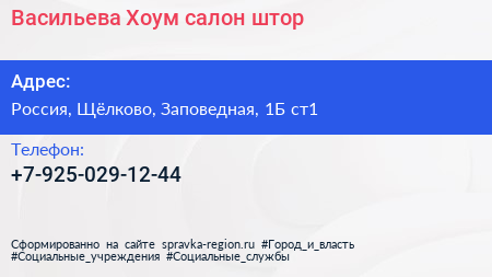 Васильева Хоум, салон штор по адресу 1Б с1, Заповедная улица, КП «Заповедный парк-2», Валентиновка, Оболдино, городской округ Щёлково, Московская область, Центральный федеральный округ, 141134, Россия в дальнейшем Организация, размещена в следующих категориях: