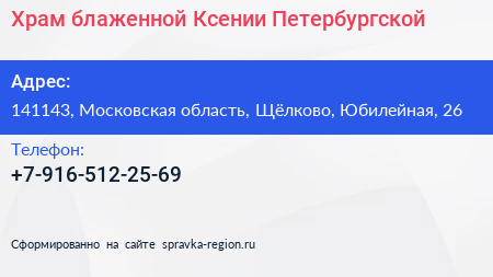 Храм блаженной Ксении Петербургской по адресу 141143, Московская область, Щёлково, Юбилейная, 26 в дальнейшем Организация, размещена в следующих категориях: