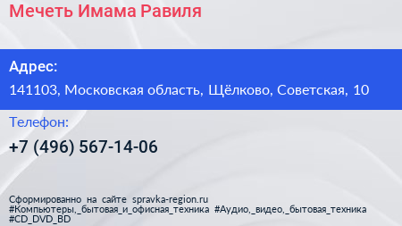 Мечеть Имама Равиля по адресу 141103, Московская область, Щёлково, Советская, 10 в дальнейшем Организация, размещена в следующих категориях:
