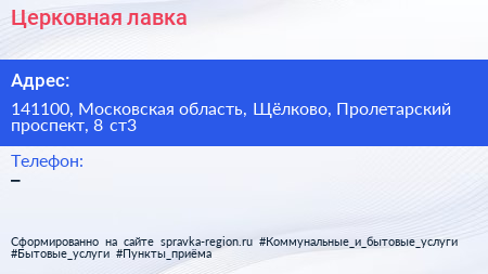 Церковная лавка по адресу 141100, Московская область, Щёлково, Пролетарский проспект, 8 ст3 в дальнейшем Организация, размещена в следующих категориях: