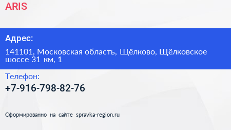 ARIS по адресу 141101, Московская область, Щёлково, Щёлковское шоссе 31 км, 1 в дальнейшем Организация, размещена в следующих категориях: