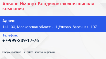 Альянс-Импорт, Владивостокская шинная компания по адресу 141100, Московская область, Щёлково, Заречная, 107 в дальнейшем Организация, размещена в следующих категориях: