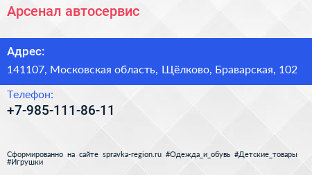 Арсенал, автосервис по адресу 141107, Московская область, Щёлково, Браварская, 102 в дальнейшем Организация, размещена в следующих категориях: