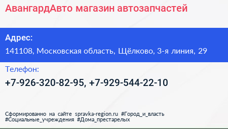 АвангардАвто, магазин автозапчастей по адресу 141108, Московская область, Щёлково, 3-я линия, 29 в дальнейшем Организация, размещена в следующих категориях: