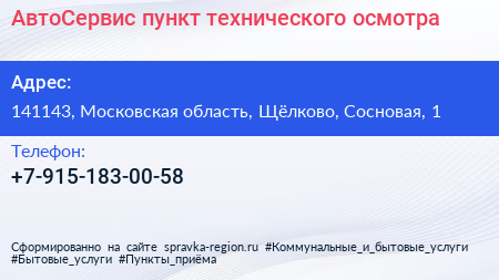 АвтоСервис, пункт технического осмотра по адресу 141143, Московская область, Щёлково, Сосновая, 1 в дальнейшем Организация, размещена в следующих категориях: