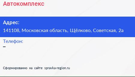 Автокомплекс по адресу 141108, Московская область, Щёлково, Советская, 2а в дальнейшем Организация, размещена в следующих категориях: