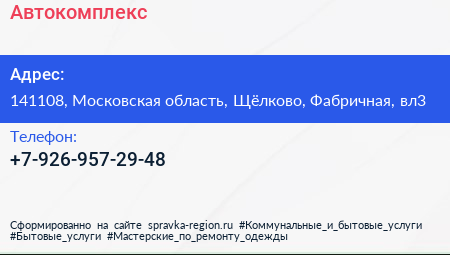 Автокомплекс по адресу 141108, Московская область, Щёлково, Фабричная, вл3 в дальнейшем Организация, размещена в следующих категориях: