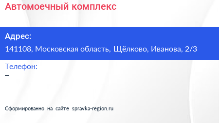 Автомоечный комплекс по адресу 141108, Московская область, Щёлково, Иванова, 2/3 в дальнейшем Организация, размещена в следующих категориях: