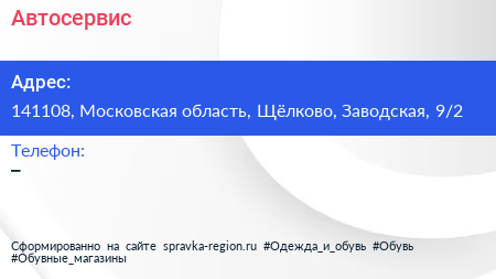 Автосервис по адресу 141108, Московская область, Щёлково, Заводская, 9/2 в дальнейшем Организация, размещена в следующих категориях: