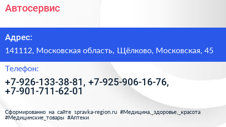 Автосервис по адресу 141112, Московская область, Щёлково, Московская, 45 в дальнейшем Организация, размещена в следующих категориях: