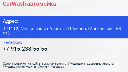 CarWash, автомойка по адресу 141112, Московская область, Щёлково, Московская, 68 ст1 в дальнейшем Организация, размещена в следующих категориях: