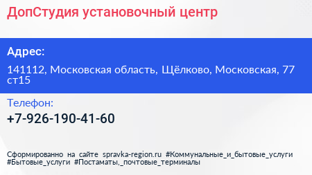 ДопСтудия, установочный центр по адресу 141112, Московская область, Щёлково, Московская, 77 ст15 в дальнейшем Организация, размещена в следующих категориях: