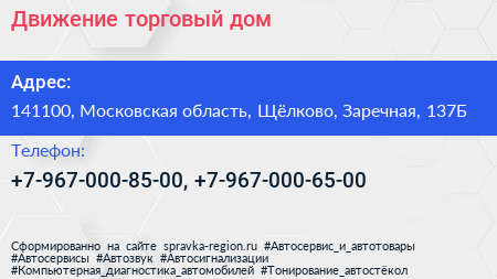 Движение, торговый дом по адресу 141100, Московская область, Щёлково, Заречная, 137Б в дальнейшем Организация, размещена в следующих категориях: